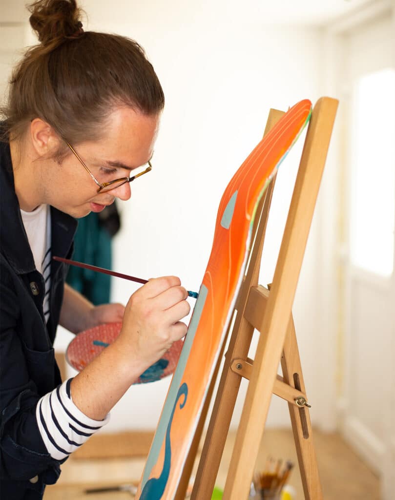 Elle gère la production, les commandes, les envois, les échanges, la qualité, la logistique, les partenaires… tout ce qui permet au travail d’Étienne d’exister en dehors de son carnet de croquis. C’est aussi elle qui veille à ce que la démarche reste locale, simple, cohérente, humaine. Rien n’est industrialisé : chaque étape passe par leurs mains, leurs choix, leurs valeurs.