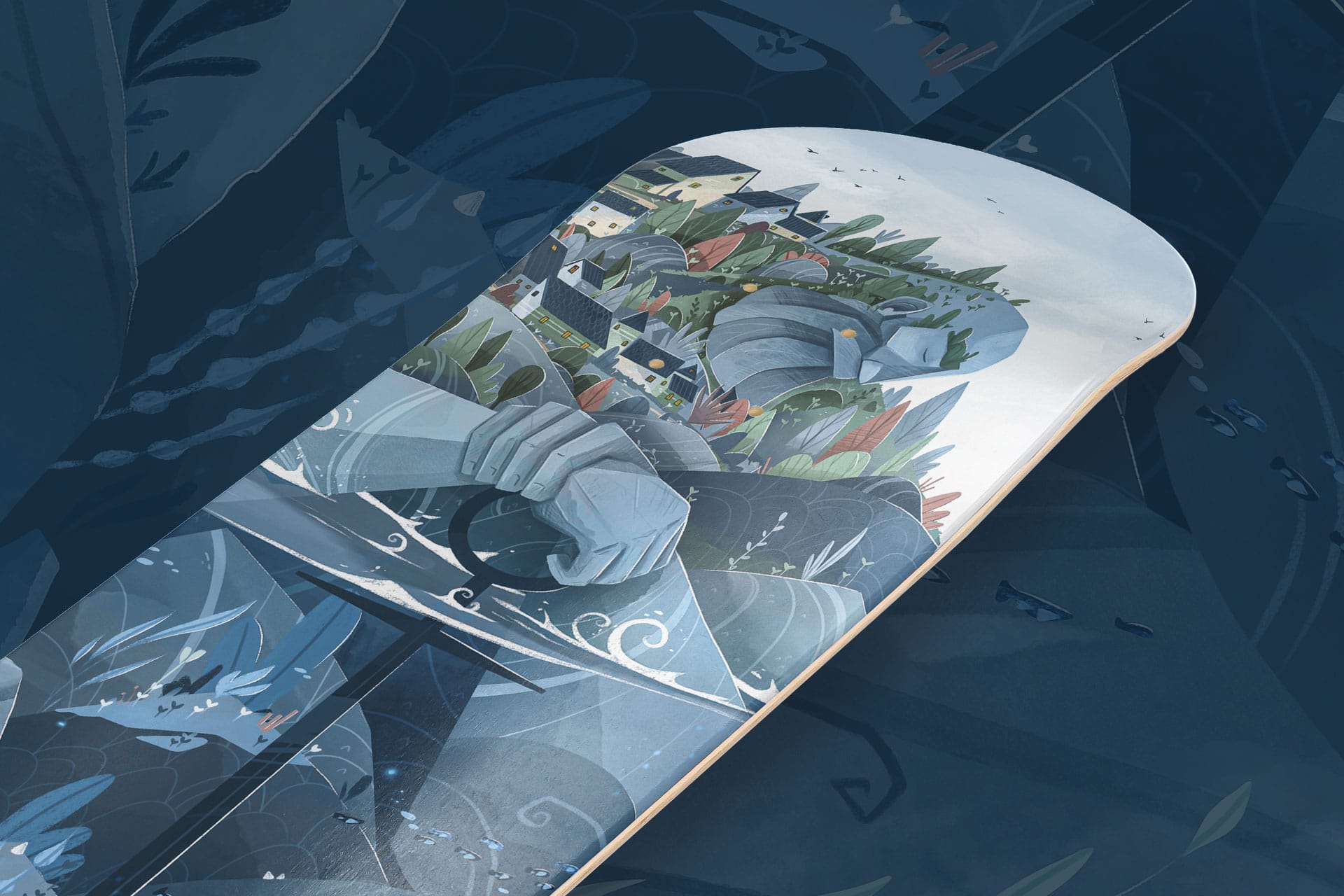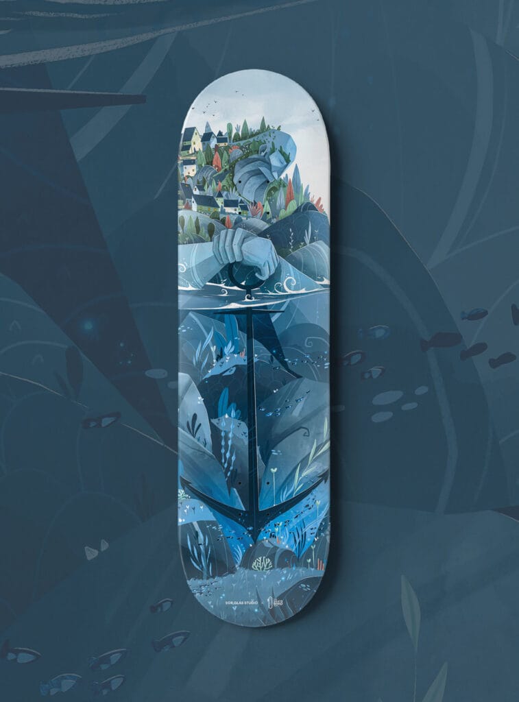 En haut, un village paisible, accroché aux collines. Au centre, un colosse endormi, sculptural, les mains serrées sur une immense ancre — un gardien, un mythe, une présence presque minérale. La ligne d’eau coupe le visuel et bascule vers un autre univers : celui des profondeurs. Plantes marines, poissons, lumières diffuses, mouvements lents et silencieux. L’ancre traverse la mer comme un lien entre le quotidien et l’imaginaire.